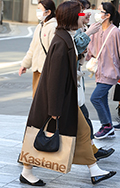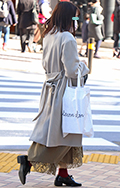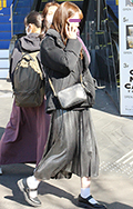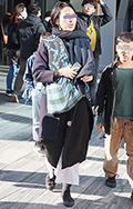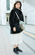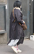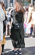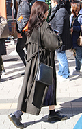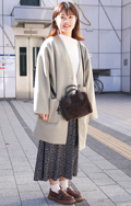 黒いコートとロングスカートに、ボーダーストラップのショルダー...