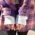 このチェックのアウターは、お母さんと買い物していたときに目について、一目惚れして買いました。もう一色あったんですけど、もう一色は茶色メインな感じだったので、色が入っていて目立っているこっちの方が可愛かったんです。特に、チェックのアウターが欲しかったわけではないです。インナーに色味がある服を着ることが多いので、茶系のチェックジャケットは持っています。でも、色味のあるチェックジャケットは持っていなかったので買いました。全身茶系のコーディネートは惹かれないです。まだ若くいたいっていうか、柄とか入っていた方が可愛く見えるし、落ち着いているよりかは遊び心がある方が可愛いと思います。