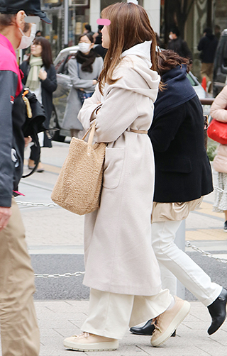フードがついているアウター、またはインナーのフード部分をアウターにの上に露出して着用している男女すべて。色や柄、素材、サイズなどは問わない。