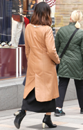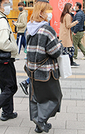 こちらの女性はマキシ丈のレザーコートにチェック柄のライナージ...