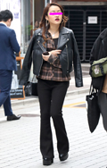ライダーズのハードなニュアンスにフレアパンツ×厚底ブーツ、カ...