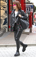 超ビッグサイズのライダースジャケットにレザーパンツを合わせた...
