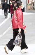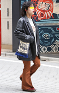 レザーのテーラードジャケットにフレパンツ、エスニック調のバッ...
