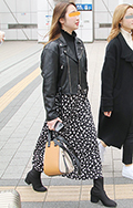 ハードな印象になりそうなレザーのライダースに柄スカート、グレ...