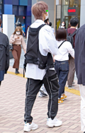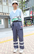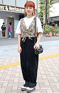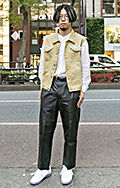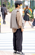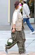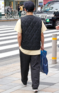 ストリートカジュアル系のスタイルにキルティングのベストをレイ...