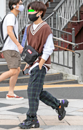 Vネックのライン入りベストとチェックのパンツでスクール風のコ...