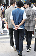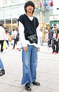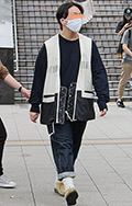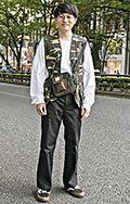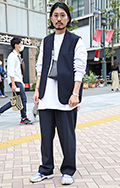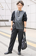 モードテイストを好みそうな彼はシャツに光沢のあるベストが落ち...