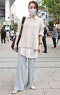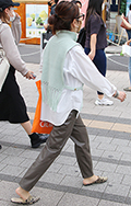 Tシャツの上に同系色のニットベストをレイヤード。女性には丈が...