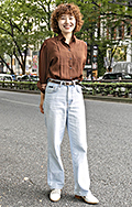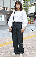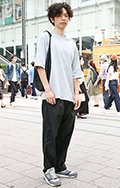 ソフトパーマがラフなTシャツ×タックパンツに華やかさを加えて...