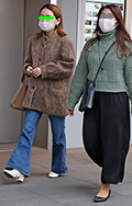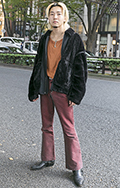 古着っぽい毛皮のコートにベルボトムジーンズで70sっぽいムー...