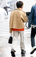 ジャケットのベージュ~パンツのオフホワイト~スニーカーのホワ...