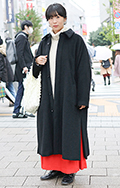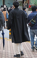 黒のロングコートから白パンツを覗かせたモノトーンコーディネー...