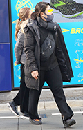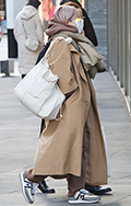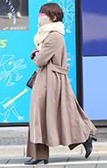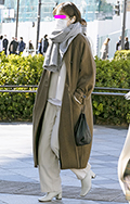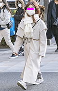 コートと同系色のフーディの上からさらに同系色のダウンマフラー...