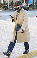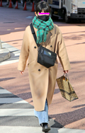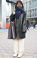トレンチコートの襟元をワンループ巻きのマフラーでしっかりプロ...