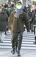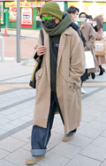 オーバーサイズのミリタリーアウターにマフラーをぐるぐる巻きつ...