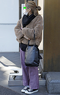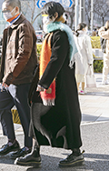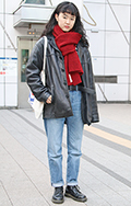 インナーの黒と色を合わせたマフラールック。上半身のモコモコと...