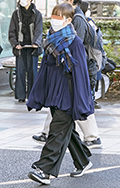 マフラーの端を後ろに垂らしてスヌードのようなシルエットを形成...