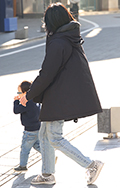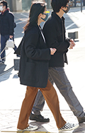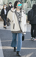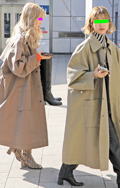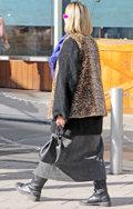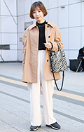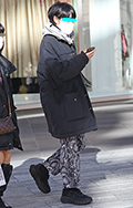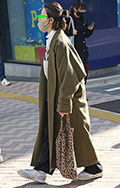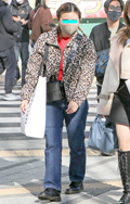 華やかなピンクのコートが目を引いた彼女。足元はレオパード柄の...