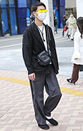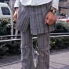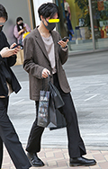 ジャケット+フレアパンツに巾着バッグ、ネックレスを着用した男...