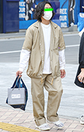 ベージュの上下でセットアップ風コーディネートの男性。カジュア...