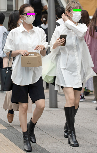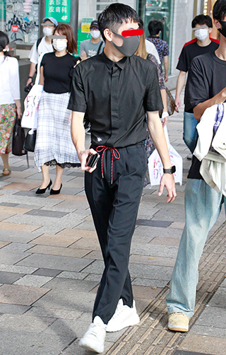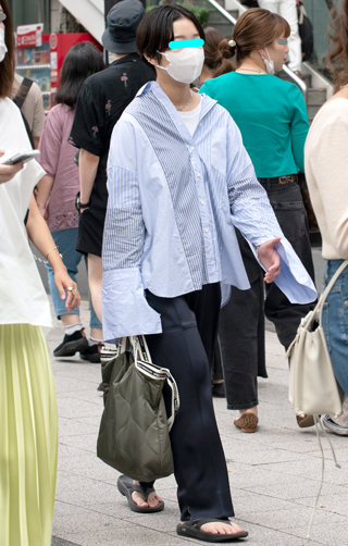 身頃と袖があり、ボタンがある布帛のトップスを着用している人すべて。色や柄は問わない。襟の有無、袖の長さも問わない。シャツワンピースの場合はパンツ等とのレイヤードスタイルであればシャツに含む。