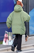 レンガ色のニットキャップがカーキのアウターとマッチ。手に持っ...
