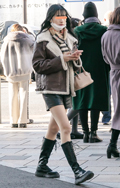 ムートンジャケット+ミニ丈ボトムス+ロングのチャンキーブーツ...
