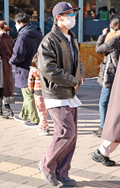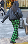 古着っぽい味のあるアウターにはやや派手な色と柄のボトムスで音...