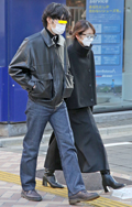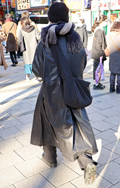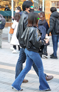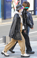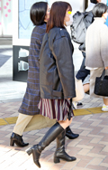 黒レザーアウターの2人組。女性の方は、お腹が出てしまいそうな...