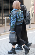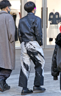 ショート丈のレザージャケットに大胆なペイント柄のワイドパンツ...