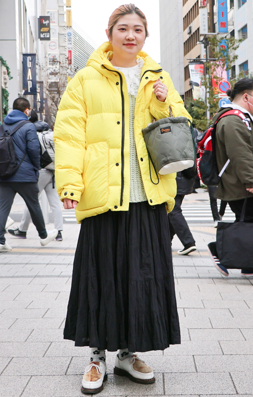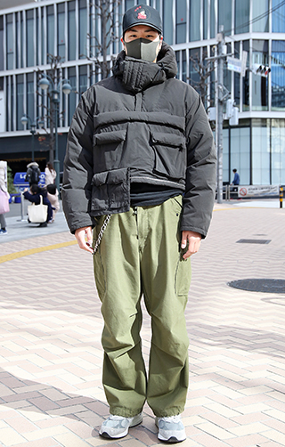 いちばん上に着たアイテムの中にダウンやフェザー、綿などのインサレーションが入って膨らみが感じられいちばん上に着たアイテム。色や柄、表面の素材も問わない。