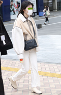 パイピングがあしらわれた白いアウターは大ヒット。ボトムスも白...