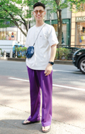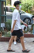 白Tシャツ×黒いショーツという超シンプルなスタイルの男性が目...