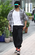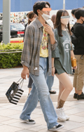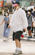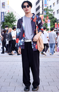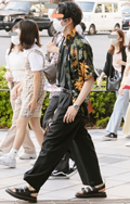 今年のシャツの着こなしを象徴するような、半袖の柄シャツを羽織...