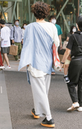 シャツのクロス掛けスタイルもかなり一般化。ワンショルダーのト...