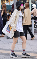 Tシャツ+ショートパンツのカジュアルスタイルも、シャツを羽織...