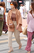 秋を先取るかのように茶ベージュ系でまとめたシャツ羽織りスタイ...