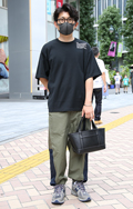モードな印象の黒いカーゴパンツの裾を絞ってはきこなした男性。...