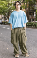 たっぷり太めでしっかり裾を絞ったパンツの2人組。左はカーゴデ...