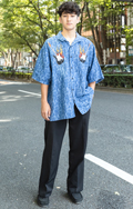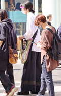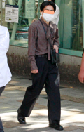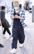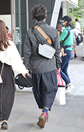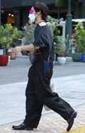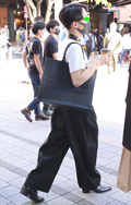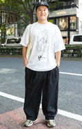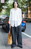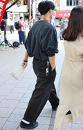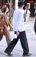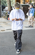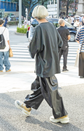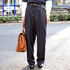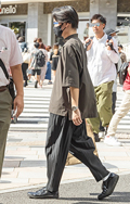 ワタリが広めで、腿から膝のあたりに身体との空間があり余裕のあるパンツ。素材は問わない。