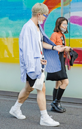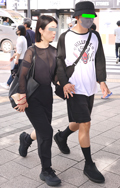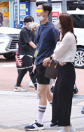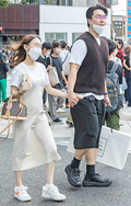 スニーカーと同系色のソックスできれいめにまとめたカップル。男...