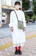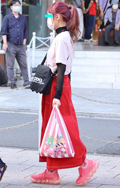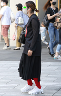 赤いソックスがアクセントになった着こなし。ロングスカートのト...