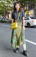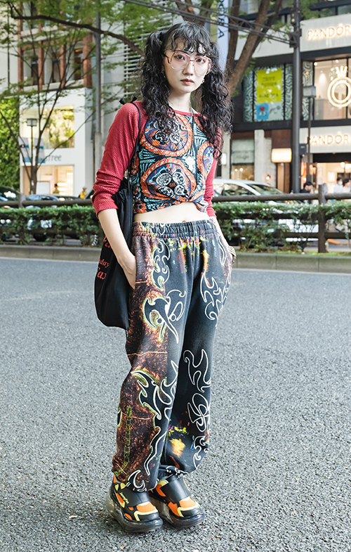 スポーツウェアにフォトプリントカットソーを合わせた派手柄コー...
