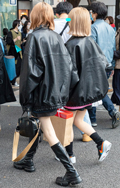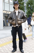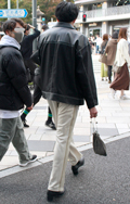 オーバーサイズのレザーブルゾンが女性にも人気。Tシャツやスラ...