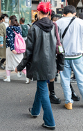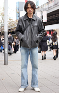 こちらもレザージャケット×色落ちジーンズで90sっぽいスタイ...