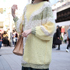 A このニットはかわいいから上にコートを着たくなくて、いまちょうどいい時期です。お店の店員さんと仲よくなって、黄色のアイテムを探していたのでひと目惚れでした。付け襟と合わせます。