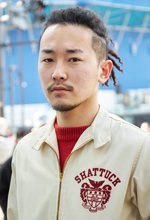 チャンピオンは普段着ませんが、バックにワッペンがあしらわれたデザインで、トラックジャケットのようなショート丈が80年代の黒人のようなイメージで惹かれて購入しました。今日のスタイリングはジャケットとパンツを主役に、赤を差し色で統一しています。普段はテーラードジャケットをよく着用しています。ベージュ、黒、赤がとても好きです。