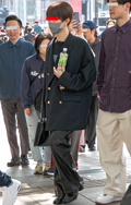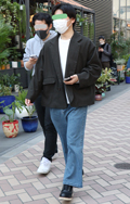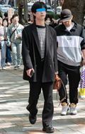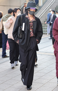 男性に多い、黒ジャケット×黒パンツのセットアップ風の着こなし...