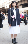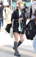 トラッドな金ボタンのジャケットをミニスカートやハイソックスで...
