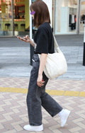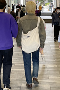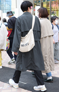 キャンバス地のトートバッグをキュッと斜めがけにしたスタイルも...